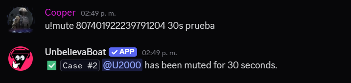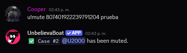 - Silencia a un usuario, impidiéndole el acceso y/o envío de mensajes en los canales de texto y voz. El mute puede ser temporal si se especifica un tiempo, o permanente si se omite dicho parámetro. Es útil para moderar el comportamiento sin necesidad de expulsar al usuario del servidor.
